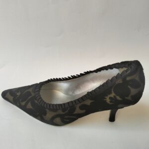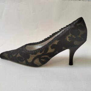 Zapatos Eferri de raso dorado con fino encaje de terciopelo negro trasparente encima y pequeño volante plegado de raso a todo alrededor ( tacón 7 cm.)