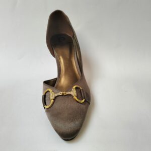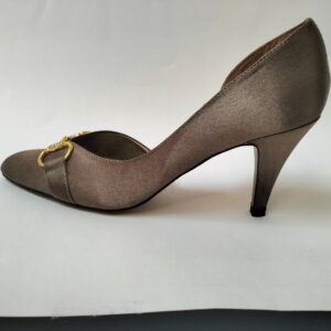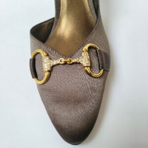 Zapatos Pierre Cardin en raso y piel con broche dorado y circonitas en color taupé marrón ( tacón 8 cm.)
